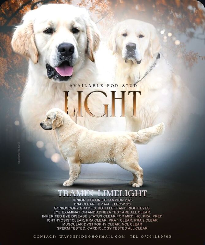 This boy has just become available for stud. I bought Light from one of the best kennels in the Ukraine after searching extensively for a wonderful Golden retriever with all correct, head, conformation and movement and a low COi.